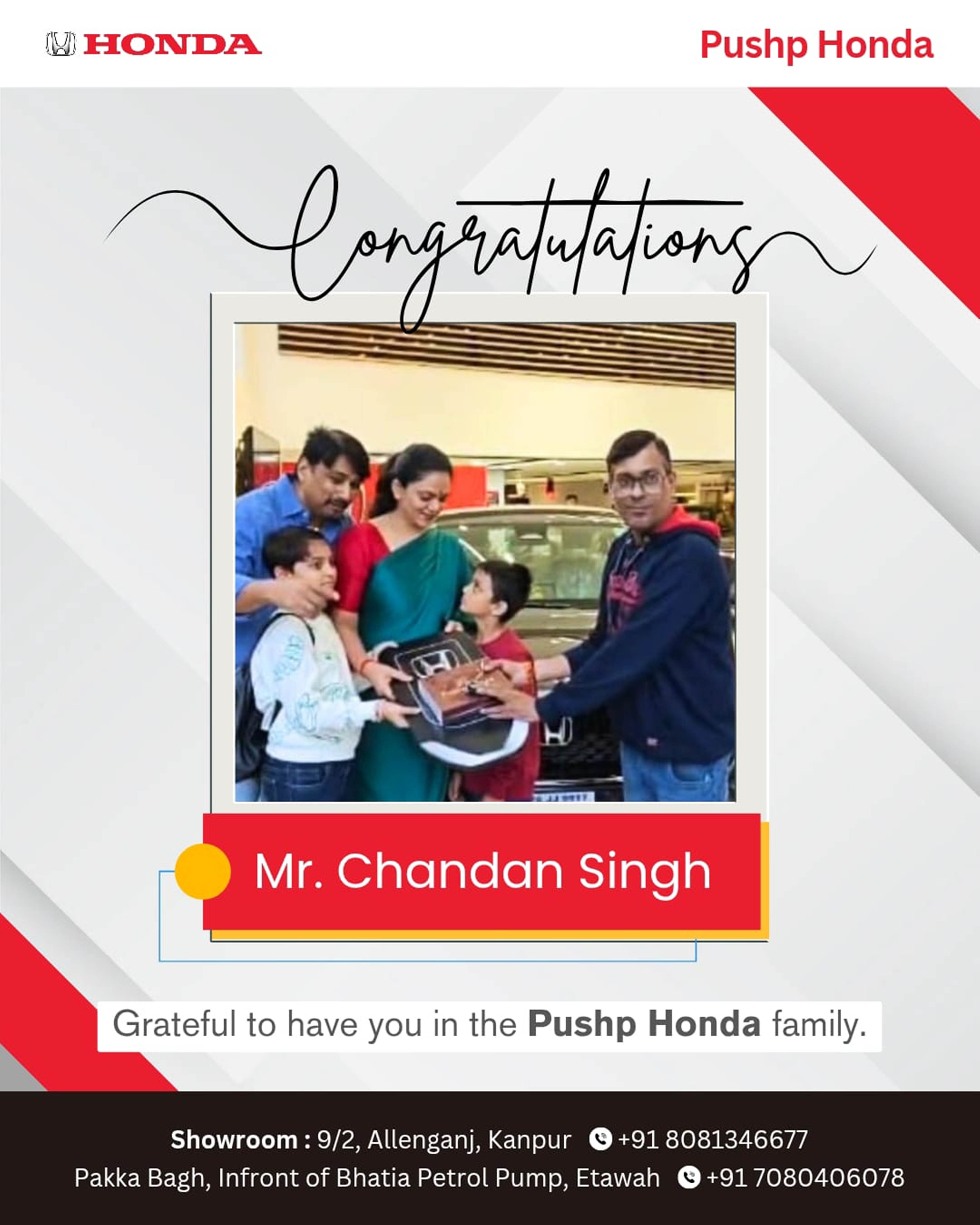 Congratulations Mr. HEMANT MISHRA to you and your family! Welcome to the Pushp Honda family ! We wish you a very happy motoring!